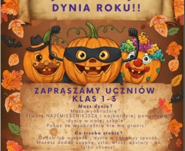 Zapraszamy uczniów klas 1–3 do udziału w konkursie „Najzabawniejsza Dynia Roku”, w którym liczy się przede wszystkim pomysłowość, poczucie humoru i kreatywność!